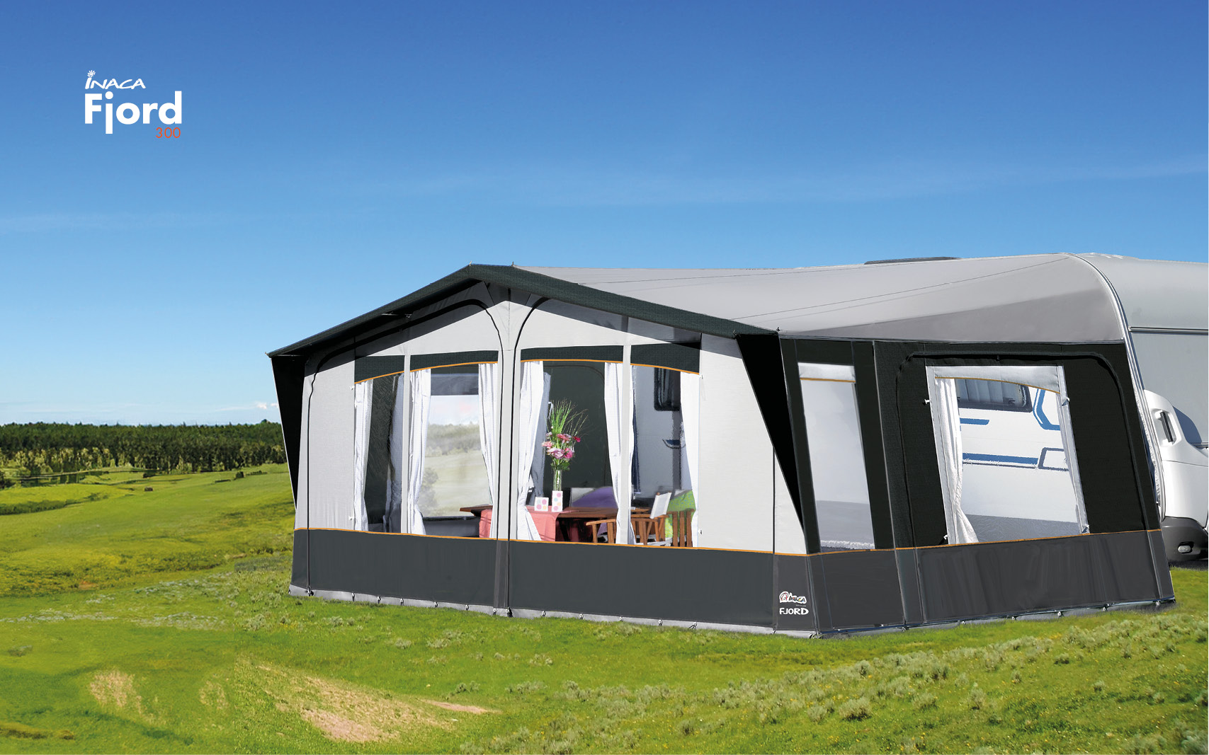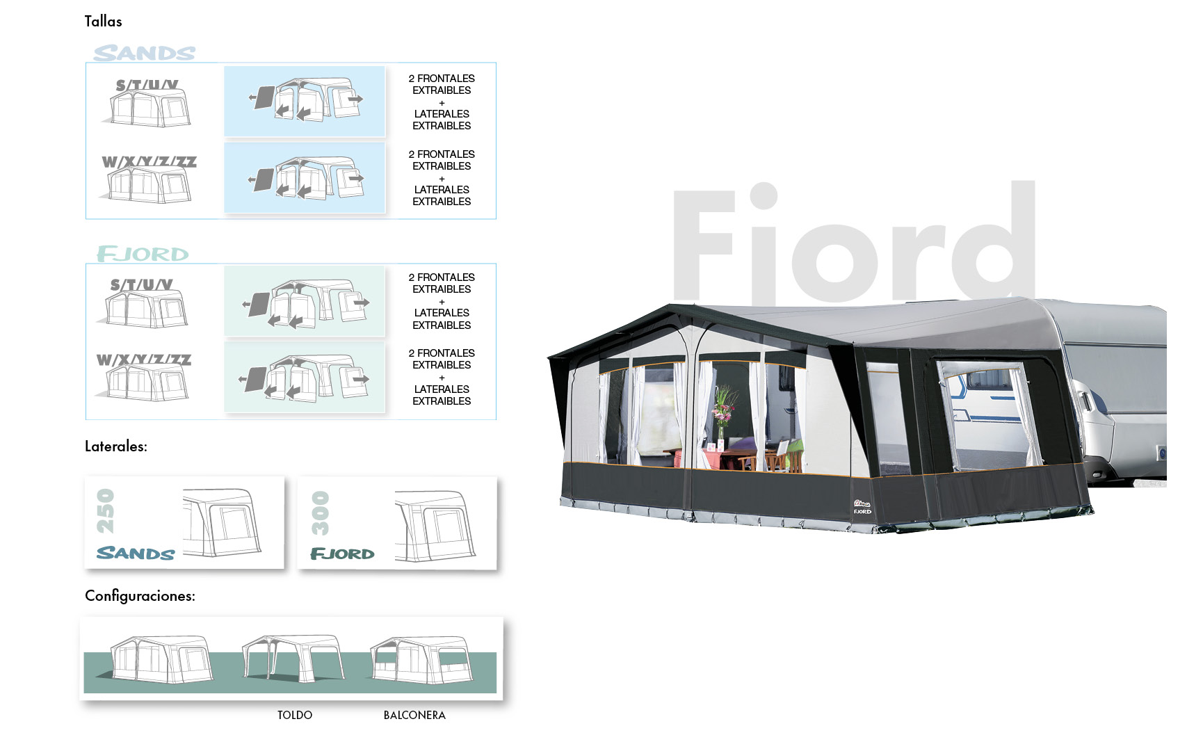 Fjord es un completo avance fabricado en tejido acrílico de calidad. Su profundidad de 3 metros y elevadas prestaciones le convierten en un avance de clase. El frontal se divide en dos paneles desmontables y consta de dos/cuatro ventanas fijas y una puerta a cada lado. Cada panel lateral es desmontable y dispone de una puerta y una ventana, la cual es abatible con mosquitera en ambos laterales. Los faldones quedarán recogidos por la parte interior del avance y los anclajes por la parte exterior.