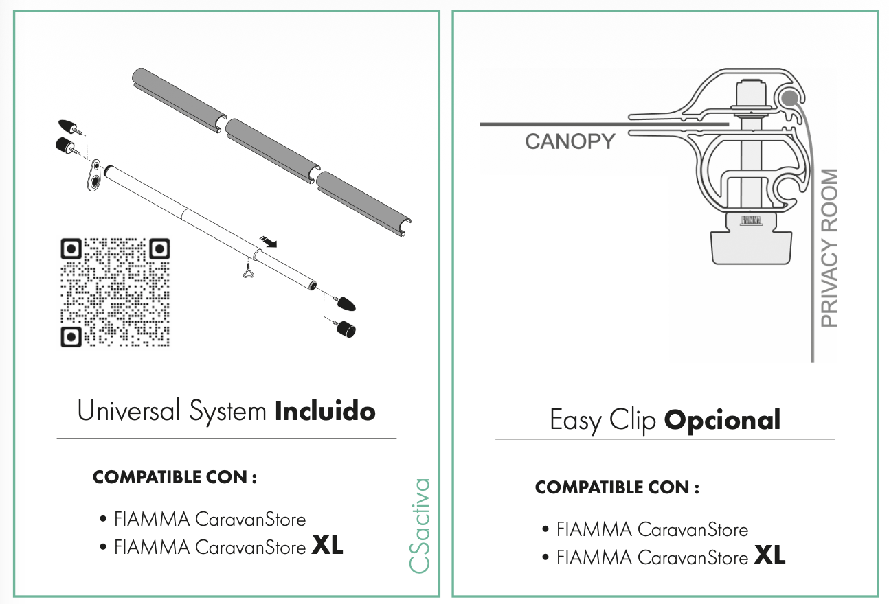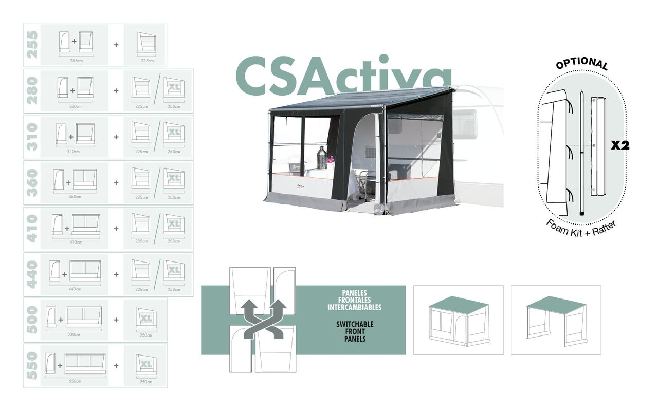 Cerramiento adaptable a FIAMMA CaravanStore y CaravanStore XL. Fabricado en poliéster Rip-Stop en atractiva combinación de colores. El frontal va provisto de puerta móvil y queda sujeto a los laterales mediante cremalleras. Los laterales son tensados con goma elástica contra la pared del vehículo y van equipados con estructura original FIAMMA, ya sea Easy clip completo o rafters sencillos.